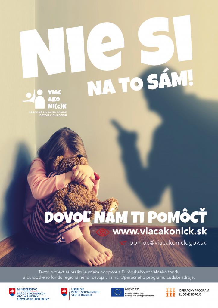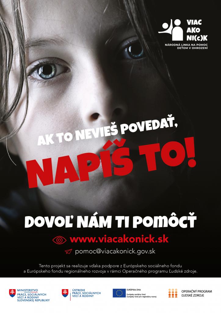 Národná linka VIAC AKO NI©K je zriadená Ústredím práce, sociálnych vecí a rodiny. Jej hlavným cieľom je pomáhať deťom v ohrození nepretržite 24 hodín denne/ 7 dní v týždni. Vyškolení odborníci dokážu prostredníctvom bezplatnej online komunikácie poskytnúť deťom rýchlu a adresnú pomoc, poradenstvo alebo podporu. Spojiť sa s nimi je možné cez chat na webovej stránke www.viacakonick.sk alebo cez mobilnú aplikáciu. Výhodou týchto nastavení je predovšetkým jednoduché ovládanie, dostupnosť a tiež funkcia rýchleho zatvorenia, teda okamžitého ukončenia komunikácie a vymazanie histórie. Dieťa, ktoré sa cíti byť ohrozené, sa rovnako môže zveriť so svojím problémom a žiadať o pomoc aj prostredníctvom e-mailu na adrese pomoc@viacakonick.gov.sk.